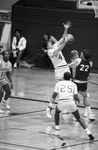 Image shows a basketball game between Arlington and South Grand Praire. Left is South Grand Praire's James Goff, grabbing a rebound over Arlington's David Wiener, right at Thomas Coliseum. Published in Fort Worth Star-Telegram morning edition February 22, 1986