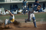 Image shows a baseball game between UT- Arlington and Briar Cliff. UT- Arlington's, Jerald Jackson beats the throw home as Briar Cliff Catcher, Boyd Pitkin waits for the throw. UTA lost the first game, 11-10. Published in Fort Worth Star-Telegram Morning edition March 7,1986.
