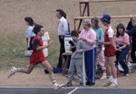 Runner crosses finish line at the Special Olympics Games at Mustang Stadium in Grapevine, 03/16/1986