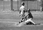 Image shows a baseball game between UT- Arlington and Louisiana Tech. Left is Tech's Jeff Richardson gets back to first base ahead of the throw to UT- Arlington Mark Howell in a Southland Conference game at the Arlington Athletic Complex. The ball is shown to going past Howell, enabling Richardson to move to third base. UTA won, 6-5. Published in Fort Worth Star-Telegram morning edition March 17,1986.