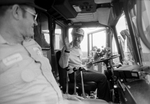 Allan Saxe, seen waving inside of a garbage truck with a bouquet of wilted flowers, celebrates the dedication of the road to the Arlington Sanitary Landfill, which was named "Allen Saxe Parkway" in Saxe’s honor and was later changed to "Allan Saxe Parkway" to correct the misspelling. About 50 people, including council members, city staff, and friends, were in attendance of the dedication and celebrated with wilted flowers and champagne.