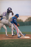 Image shows a baseball game between UTA and Texas Christian University (TCU). UT Arlington's first basemen, Doug Myers, right (10), steps on first base to retire TCU's Bernard Walker in third inning. Published in Fort Worth Star-Telegram morning edition March 26,1986.