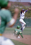 Baseball, Texas Christian University (T. C. U.) vs. California State Pomona; Texas Christian University (T. C. U.)'s 2nd baseman Brent Barker leaps for the throw. There is an unidentified player in a number 3 Jersey seated on the ground and another player in blurry view, 03/27/1986