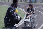 Wheelchair race competitor talks with a clown at the regional Special Olympics games at Birdville Stadium, 04/29/1986