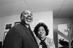 Image shows State representative Garfield Thompson, left and his wife, Dorothy Thompson, celebrating his lead for the District 5 seat. Published in Fort Worth Star-Telegram morning edition May 4, 1986.