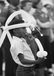 Image shows Kenrick Thomas, 7, playing with balloons during speeches at the festivities at Gateway Park on the East Side. Published in Fort Worth Star-Telegram evening edition May 14, 1986.