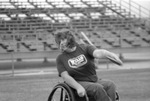 Using a special track wheelchair (wheels are slanted inward to improve balance), Lisa South practices the discus throw to prepare for competition in the Junior National Wheelchair Games in June, 05/28/1986