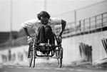 UTA's (University of Texas at Arlington) Jim Hayes practices for 205-mile wheelchair run from Austin to Arlington to raise money for Arlington Handicapped Association.