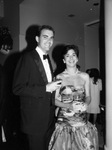 Debutante party given by Ben and Kay Fortson at River Crest Country Club for sisters Windi Phillips and Mary Sowell; Windi Phillips (right) with guest, 06/29/1986. Windi is smiling, standing next to a young man dressed in suit. Both of them are holding a glass of beverage each.
