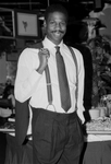 Image shows Joe Faust, holding suit, at a celebrity Stroll benefiting the Sojourner Truth Players at the Center Stage America Club. Hilton Hotel in Fort Worth. Published in Fort Worth Star-Telegram morning edition August 27, 1986.