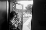 Image shows Paula Davis, Stop Six Neighborhood Organizer holding her daughter, Andrea as she looks out the door and into the streets of the Stop Six neighborhood.Published in Fort Worth Star-Telegram morning edition September 9, 1986.