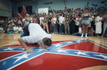 Image shows Shawn Wacasey, sophomore class president at Richland High School, kissing the Confederate Flag painted on the gymnasium floor during a pep rally. NAACP officials have given the Birdville School district and Southwest High School in Fort Worth ultimatums to drop their Rebel mascots or the group will seek state intervention. Published in Fort Worth Star-Telegram morning edition September 20, 1986.