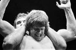 Wrestler Mike Von Erich [Mike Adkisson] grimaces as he tries to escape hold of Rick Rude [Rick Rood] during a wrestling match at Will Rogers Coliseum.