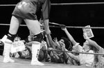 Fans seek autographs from wrestler Mike Von Erich [Mike Adkisson] after a wrestling match versus Rick Rude [Rick Rood] at Will Rogers Coliseum.