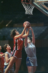 image shows a basketball game between University of Texas at Arlington and Cal-State Northridge. Cal-State's Kathleen Dixon, left, holding basketball, grabs a rebound from UT-Arlington's Debbie Gruca (51) at Texas Hall. UTA won, 91-78. Published in Fort Worth Star-Telegram morning edition December 2,1986.