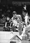 image shows a basketball game between University of Texas at Arlington and Southwest Texas State. Danny Wojciak (3), left, holding hand, bounce passes the ball past Eliezar Gorden, Southwest, right in game at UTA. Southwest Texas State won the non-conference game, 82-76. Published in Fort Worth Star-Telegram evening edition December 9,1986.