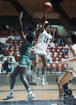 Image shows TCU and NTSU basketball game. In center, Texas Christian University's Teresia Hudson is shown leaping to pass ball over the overstretched arms of North Texas State's Clara Campbell. Published in Fort Worth Star-Telegram evening edition December 10, 1986.