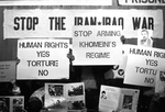 Image shows 20 students at The University of Texas at Arlington began fasting to protest both the United States weapons sale to Iran and the treatment of political prisoners in Iran, some of who are reported to be on a hunger strike. The UTA protesters above are not shown because they were afraid their families in Iran would suffer reprisals by the Khomeini government. Tony Salaki, member of the organization of Iranian Students at UTA expected 30-40 people to join the protest. The image shows protest signs and posters. Published in Fort Worth Star-Telegram morning edition December 13,1986.