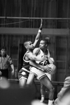 image shows a basketball game between University of Texas at Arlington and Texas Wesleyan College. On right, UTA's Darrell Nedd, holding basketball, looking for a way around Texas Wesleyan's James Smith, left. Published in Fort Worth Star-Telegram morning edition January 9,1987.