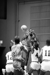 Image shows a basketball game between University of Texas at Arlington and Samford. Center is Samford's Bennie Carter, right is UTA's Alex Joseph (4). Unidentified players, from left to right, (12), (31) and (11). Published in Fort Worth Star-Telegram morning edition February 3,1987.