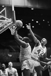 Image shows a basketball game between University of Texas at Arlington and Sam Houston State. Left is Tracy Pearson (45) goes to score around UT-Arlington's Frank Dyer (42), right. Published in Fort Worth Star-Telegram morning edition February 10,1987.