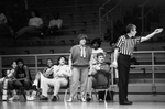 Image shows a basketball game between University of Texas at Arlington and Arkansas State. Fourth from right is Arkansas State head coach, Jerry Ann Winters. She is shown reacting to foul that was called against one her players at Texas Hall. Far right is unidentified referee, calling the foul. Arkansas State defeated UTA, 78-74. Published in Fort Worth Star-Telegram morning edition February 13,1988.