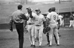 University of Texas at Arlington Pitcher Doug Myres (10) receives congratulations after pitching the Mavs to a 4-0 victory over TCU (Texas Christian University) in the first game of a double-header at the TCU diamond. Published in Fort Worth Star-Telegram morning edition February 26, 1987.