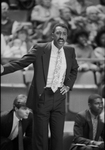 University of Texas at Arlington (UTA) vs. North Texas State University (NTSU) Game. Image is of Coach Bob "Snake" LeGrand as he coaches his last game. The Mavericks lost, 97-83. Published in Fort Worth Star-Telegram morning edition March 1, 1987.