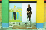 Image of Pat Patterson, a Californian artist that is sitting on a ladder in front of the frame of a transitory work. Published in Fort Worth Star-Telegram morning edition March 1, 1987.