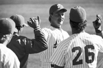 University of Texas at Arlington (UTA) pitcher Todd Carruthers, center, receives congratulations from his teammates after helping the Mavs to a victory over Texas Christian University (TCU) in the first game of their double-header. Published in Fort Worth Star-Telegram morning edition March 5, 1987.