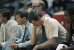 Image shows Martin High School basketball coach Danny Husband looking at strategies for a victory against Amarillo High School during the Region I Basketball tournament held in Midland, Texas. Published in Fort Worth Star-Telegram Sunday edition March 8, 1987.