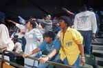 Fans are seen cheering in the bleachers during the Region I tournament basketball game, held in Midland, Texas, in which Dunbar High School and Amarillo High School were playing.