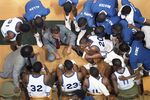 Dunbar High School players and coaches huddle up during the Region I tournament basketball game, held in Midland, Texas, in which Dunbar High School and Amarillo High School were playing. Head coach Robert Hughes is seen crouched in the middle of the huddle and assistant coach Leondas Rambo is seen at the left side.