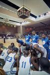 Dunbar High School players and coaches huddle up during the Region I tournament basketball game, held in Midland, Texas, in which Dunbar High School and Amarillo High School were playing. Coach Robert Hughes is seen crouched towards the back of the huddle, facing the camera.