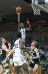 A Dunbar High School basketball player is seen taking a shot with the ball during the Region I tournament basketball game, held in Midland, Texas, against Amarillo High School.