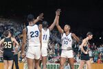 Dunbar High School basketball players are seen celebrating on the court during the Region I tournament basketball game, held in Midland, Texas, against Amarillo High School.