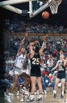 A Dunbar High School basketball player is seen reaching for the ball during the Region I tournament basketball game, held in Midland, Texas, against Amarillo High School.