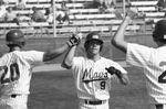 University of Texas at Arlington's (UTA) Pat Varni is congratulated by teammates Rodney Fowler, left, and Matt Webb, right, after scoring in the sixth inning of the first game against Sam Houston. Published in Fort Worth Star-Telegram morning edition March 9, 1987.