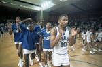 Image shows eight Dunbar High School basketball team with Derrick Daniels (10) on right, who scored 18 points, leading his team in a celebration after the Region I victory against Amarillo. Published in Fort Worth Star-Telegram morning edition March 9, 1987.