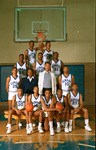 Image of Dunbar High School basketball team members, front row left to right, Myron Wilson, Roderick Mapps, Marc Speed, Randy Williams and Lionel Hamilton. Second row, Sean Allen, coach Leondas Rambo, coach Robert Hughes Sr. and Derrick Daniels. Third row, Darren Howard, Coyle Allen and Mark Chambers. Top row, William McDonald and Quinstin Boozer., Fort Worth, 03/15/1987