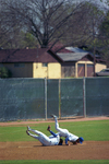 UT-Arlington's (University of Texas at Arlington) Pat Varni, on bottom, and shortstop Stephen Hodge collide while chasing down a fly ball against Texas Wesleyan. Neither were hurt in the fall. Published in Fort Worth Star-Telegram evening edition March 25, 1987.