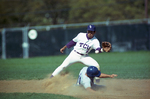 UT-Arlington 's (University of Texas at Arlington) Howard Prager steals as Texas Christian University's (TCU) Fred Benavides awaits throw. Published in Fort Worth Star-Telegram morning edition April 16, 1987.