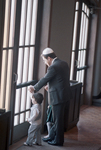 Image shows Randall Kahan, right and his two children, Jonathan, 2, left and Abby, 3, center, leave a Holocaust service at Congregation Beth-El in memory of the 6 million Jews killed in death camps. Published in Fort Worth Star-Telegram morning edition April 27, 1987.