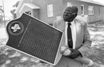Image shows Reverend Lloyd G. Austin, pastor at St. John Missionary Baptist Church, he is shown holding a historical marker plaque that will dedicate the church. Published in Fort Worth Star-Telegram evening edition May 2, 1987.