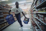 Dallas Mavericks basketball player Rolando Blackman rungs through Kroger supermarket in Fort Worth's Woodhaven neighborhood to help open a six-week drive for the Muscular Dystrophy Association, 08/06/1987