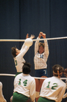 Image shows a UTA and North Texas State Volleyball Game. On right, UTA's Chris Rudiger (12) spikes a ball past North Texas State's Wendy Rinks, left during volleyball game. Published in Fort Worth Star-Telegram morning edition September 10, 1987.