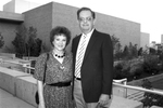 Image shows Eleonore and John McElroy at a reception honoring the new dean of engineering, Dr. John McElroy and the new dean of architecture and environmental design, Dr. Edward M. Baum at the courtyard of the architectural and design building at The University of Texas at Arlington. Published in Fort Worth Star-Telegram evening edition September 15, 1987.