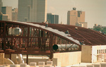 Workmen installing roof of Equestrian Center, Will Rogers complex.