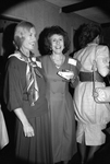 Image shows Desa Spidle , left and Cherie Snowden, right, in colonial dresses and bonnets at a University lecture series brunch, hosted at Betty Nedderman's home . They are introducing a UTA lecture series "Pioneering Women; Petticoats and Pride". Published in Fort Worth Star-Telegram morning edition September 30, 1987.