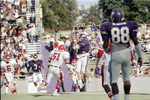 Ricky Stone catches pass for Texas Christian University (T. C. U.) in homecoming football game against University of Houston.